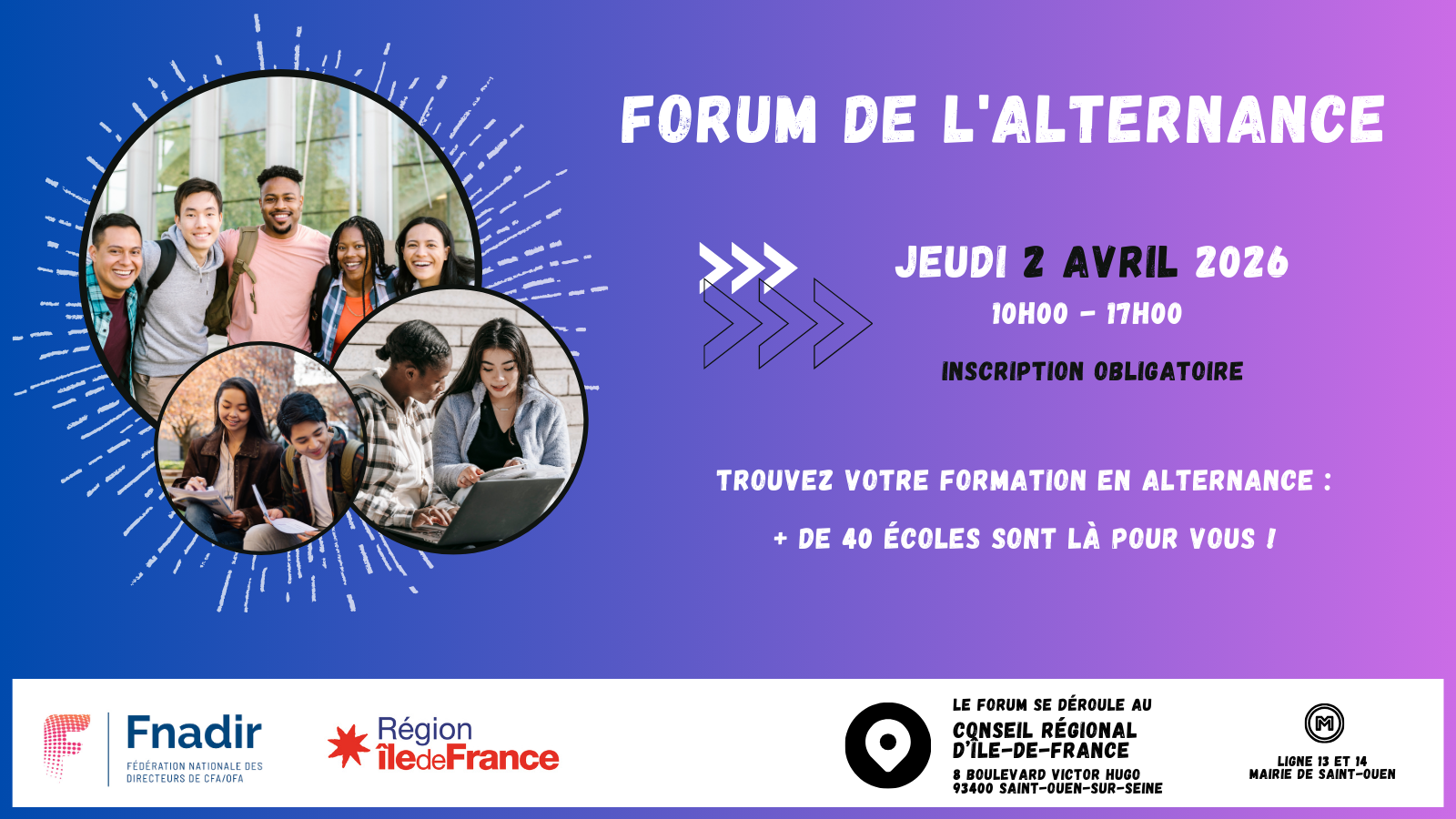 La Région Île-de-France et la FNADIR (Fédération nationale des directeurs CFA/OFA) s'engagent pour promouvoir l'apprentissage en organisant un forum de l'alternance à destination des jeunes franciliens dans les locaux du siège de la Région à Saint-Ouen-sur-Seine.